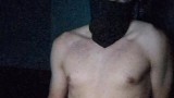 Masked man edging himself, whimpering and heavy breathing