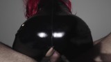 I ride him in reverse in my latex suit, but my pussy is too tight and he can't resist