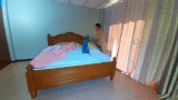 Nudist housekeeper Regina Noir makes the bedding in the bedroom. Naked maid. Naked housewife. c2