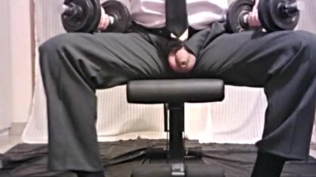 EJERCICIOS CON MANCUERNAS DE TRAJE Y CORBATA Y MOSTRANDO MI POLLA Y HUEVOS